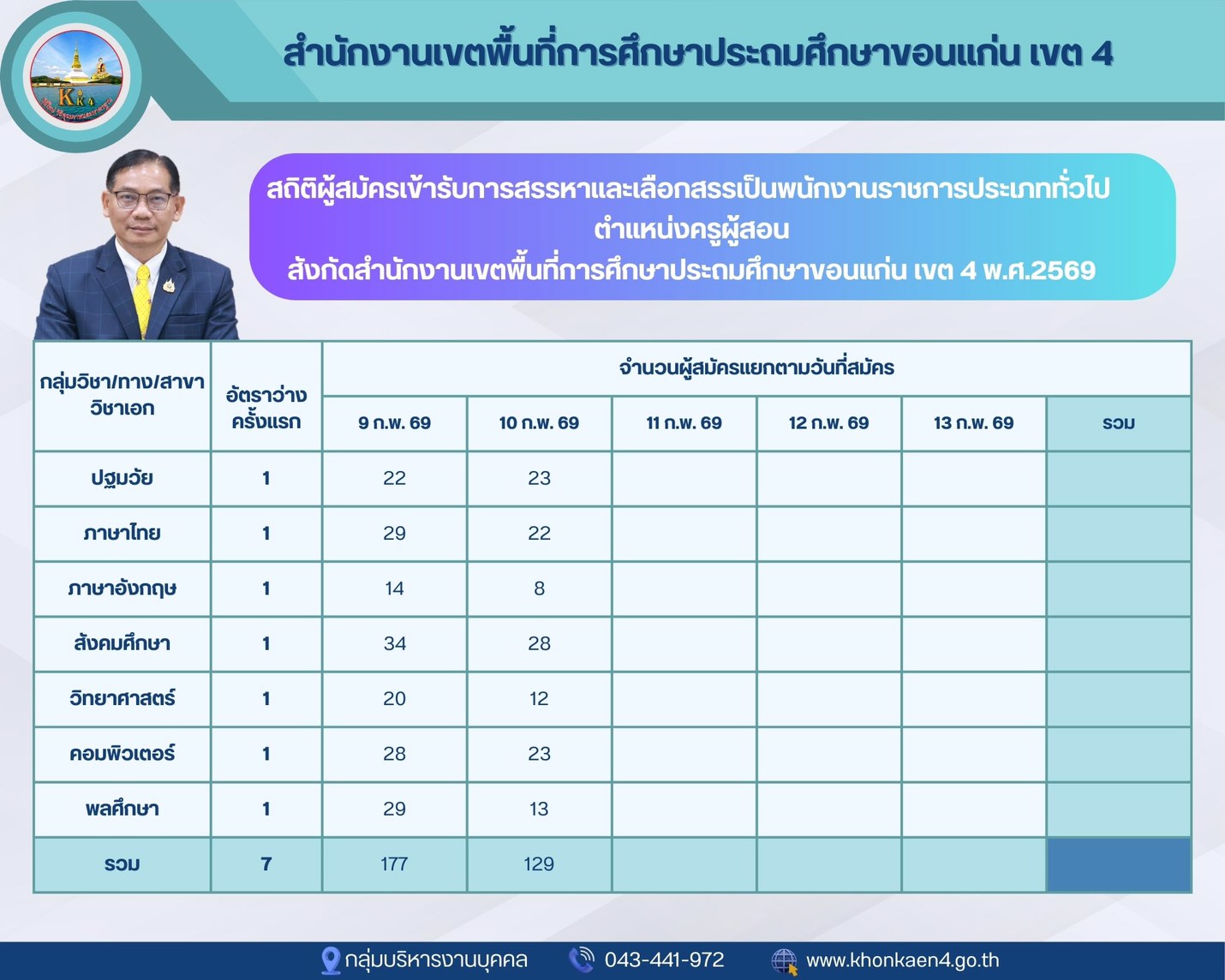 - รับสมัครบุคคลเพื่อสรรหาและเลือกสรรเป็นพนักงานราชการประเภททั่วไป สังกัดสำนักงานเขตพื้นที่การศึกษาประถมศึกษาขอนแก่น เขต 4 ปี พ.ศ. 2569 02/ก.พ./2026