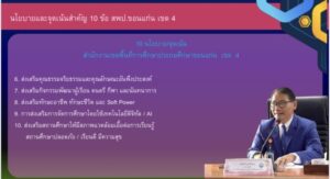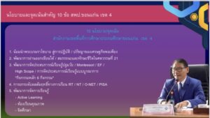 วันจันทร์ที่ 28 ตุลาคม 2567 ดร.วิโรจน์ ค้อไผ่ ผู้อำนายการสำนักงานเขตพื้นที่การศึกษาประถมศึกษาขอนแก่น เขต 4 พร้อมด้วย รองผู้อำนวยการสำนักงานเขตพื้นที่การศึกษาประถมศึกษาขอนแก่น เขต 4 ผู้อำนวยการกลุ่ม ศึกษานิเทศก์ ประชุมผู้บริหารสถานศึกษา เพื่อเตรียมความพร้อมก่อนเปิดภาคเรียนที่ 2/2567 และมอบแนวทางการดำเนินงานขับเคลื่อนนโยบายการพัฒนาคุณภาพการศึกษาประจำปี พ.ศ.2568 โดยเน้นย้ำนโยบายการศึกษาของพลตำรวจเอก เพิ่มพูน ชิดชอบ รัฐมนตรีว่าการกระทรวงศึกษาธิการ “เรียนดี มีความสุข” พร้อมทั้งมอบ 10 นโยบายและจุดเน้นของสำนักงานเขตพื้นที่การศึกษาประถมศึกษาขอนแก่น เขต 4 ที่จะขับเคลื่อนคุณภาพการศึกษาในปี พ.ศ.2568 พร้อมนี้ได้มอบประกาศเกียรติบัตรให้โรงเรียน ผู้บริหารสถานศึกษา และข้าราชการครูที่มีผลงานดีเด่น ในการประชุมครั้งนี้