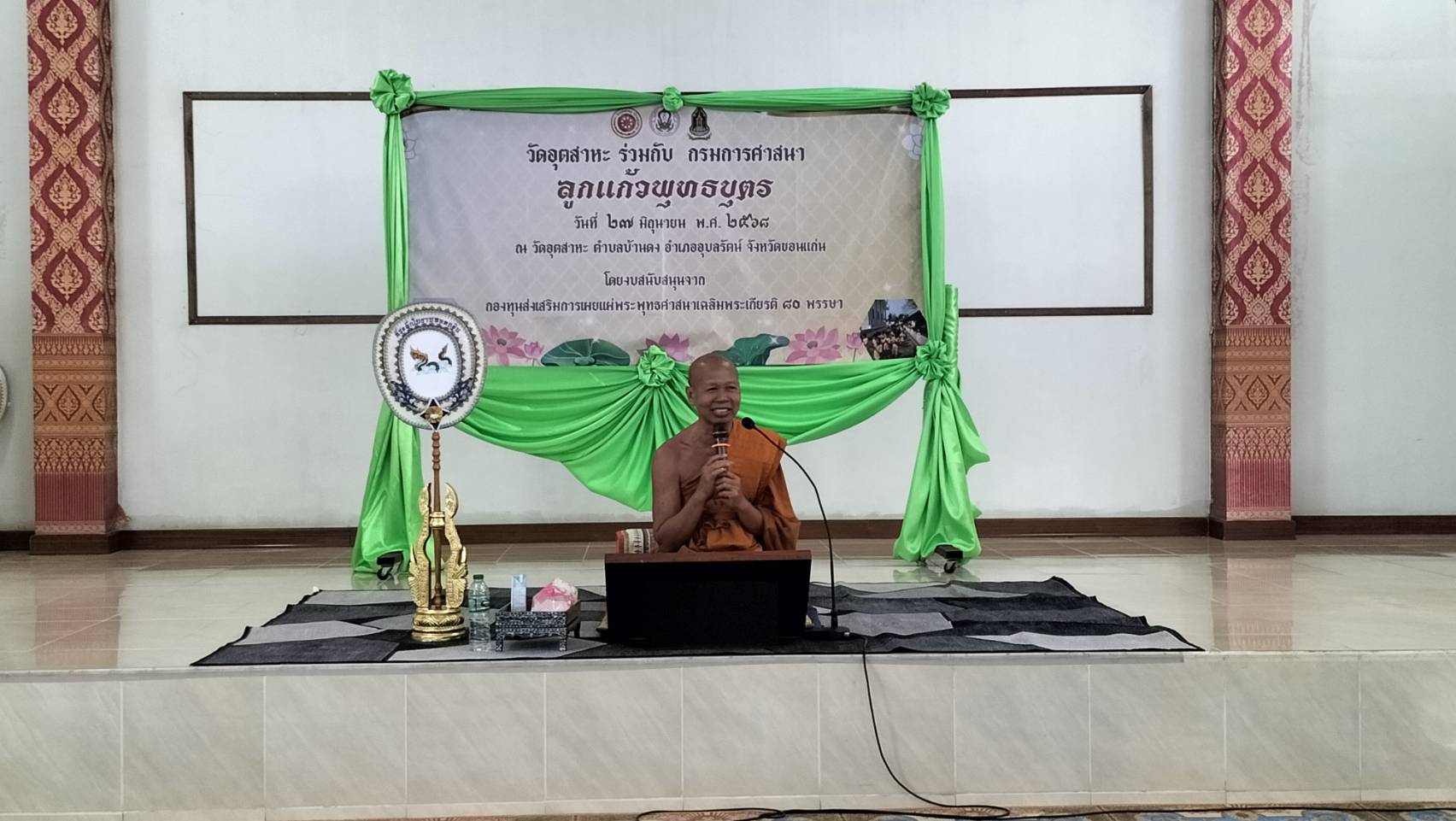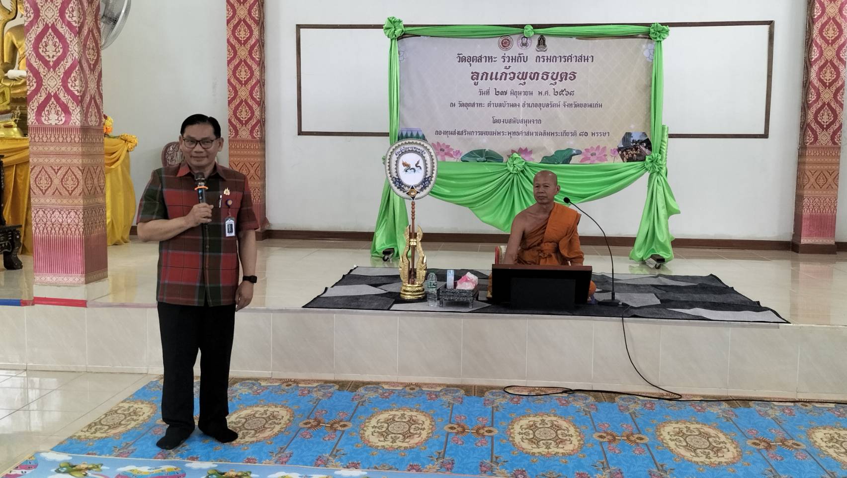 – เวลา 12.00 น. ตรวจเยี่ยมการเข้าค่ายลูกแก้วพุทธบุตร ณ วัดอุตสาหะ ต.บ้านดง อ.อุบลรัตน์ จ.ขอนแก่น โดยการสนับสนุนจากกองทุนส่งเสริมการเผยแผ่พระพุทธศาสนาเฉลิมพระเกียรติ 80 พรรษา มีนักเรียนจาก 4 โรงเรียนเข้าร่วมโครงการประกอบด้วย โรงเรียนบ้านดง (บึงไทรพิทยาคาร) โรงเรียนบ้านกุดเชียงมี โรงเรียนบ้านขุนด่าน รร.บ้านทรัพย์ภูพานคำปลาหลายหนองผักแว่น รวมจำน 120 คน โดยได้รับเมตตาจากพระครูวิริยธรรมโสภณ / เจ้าอาวาสวัดอุตสาหะ , เจ้าคณะตำบลบ้านดง เขต 2 เป็นวิทยากรในการอบรม