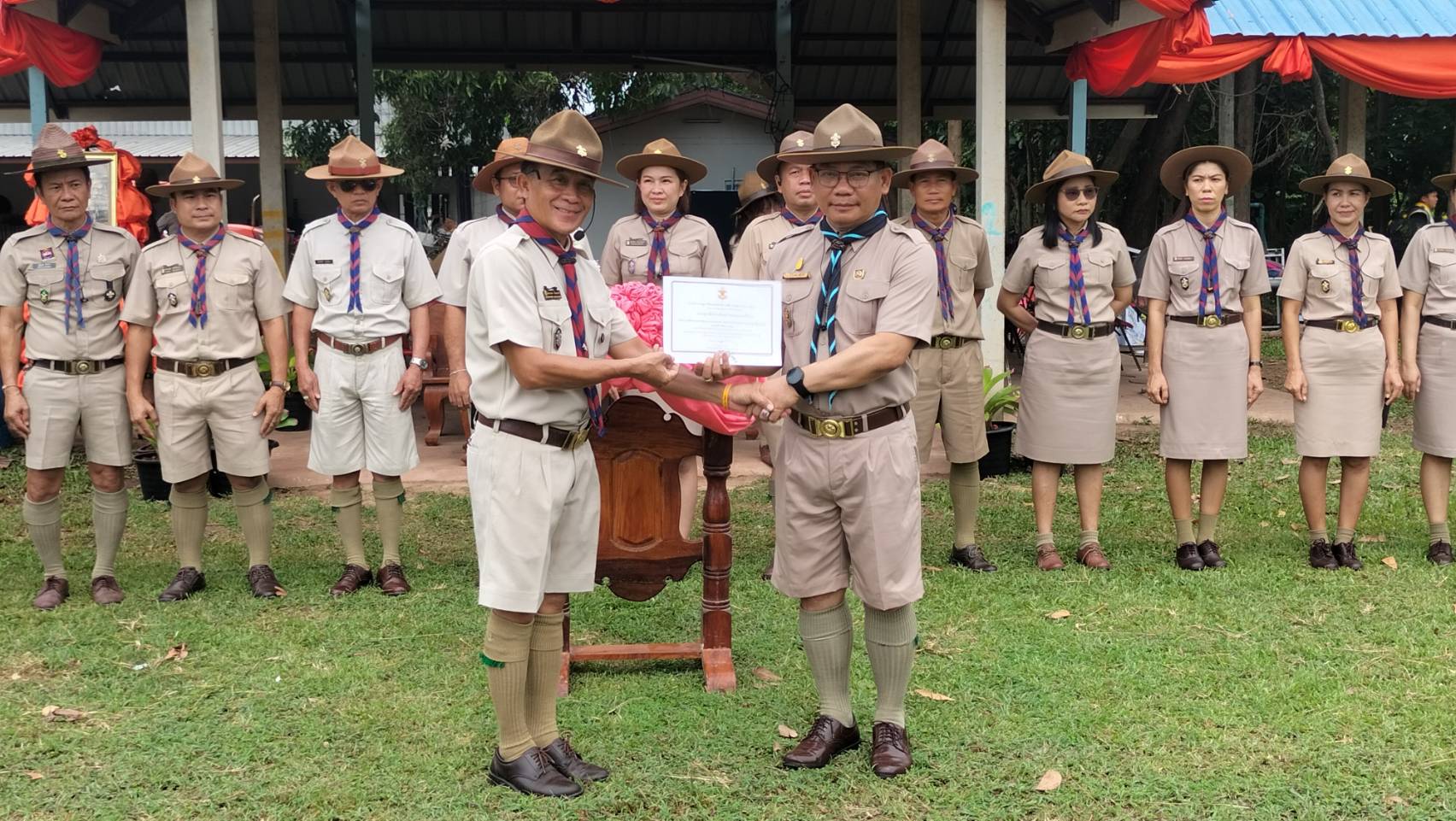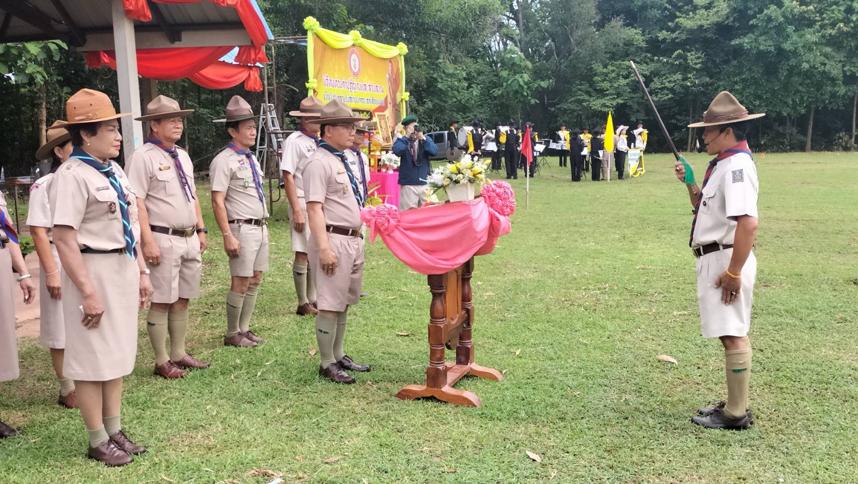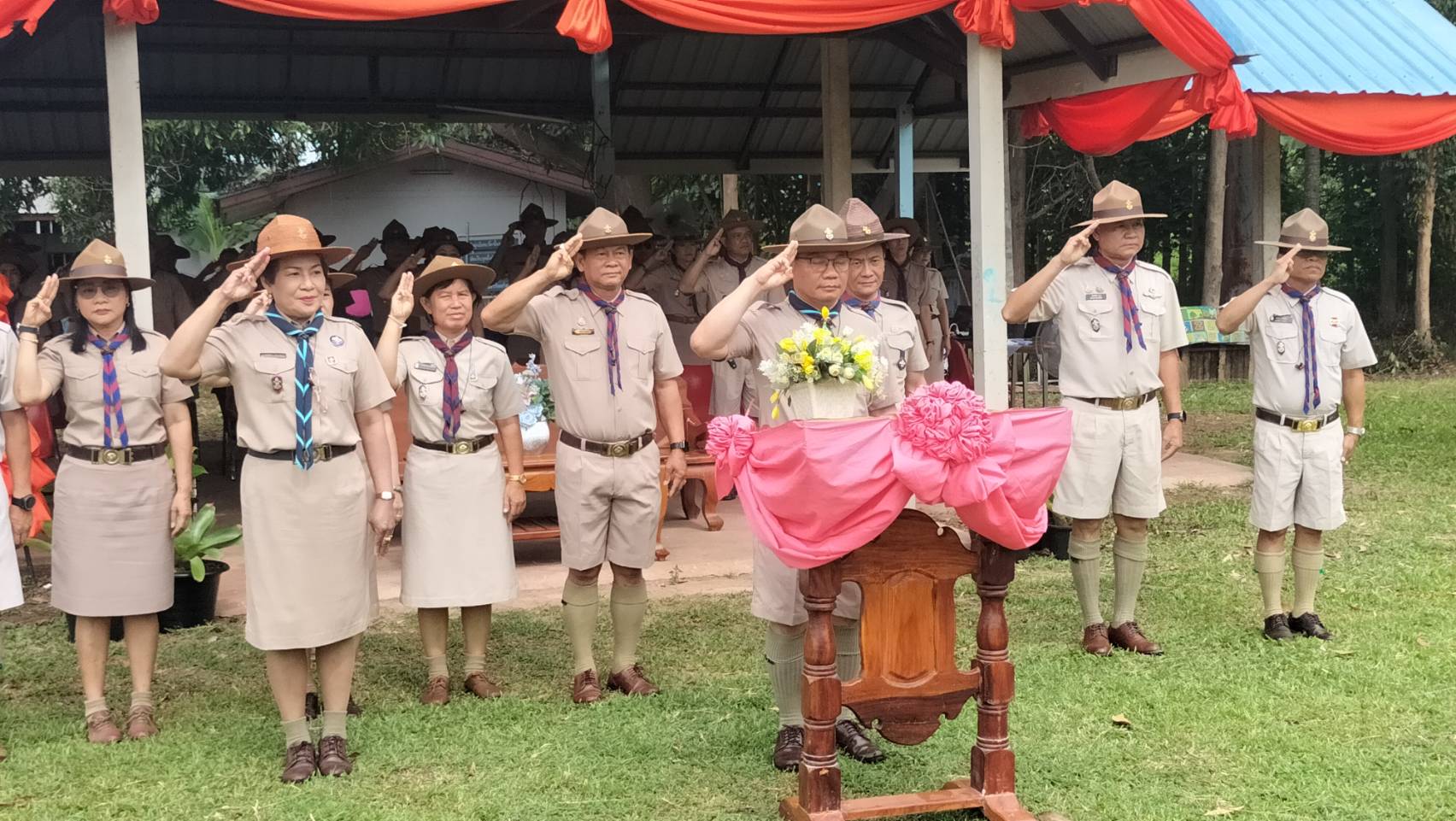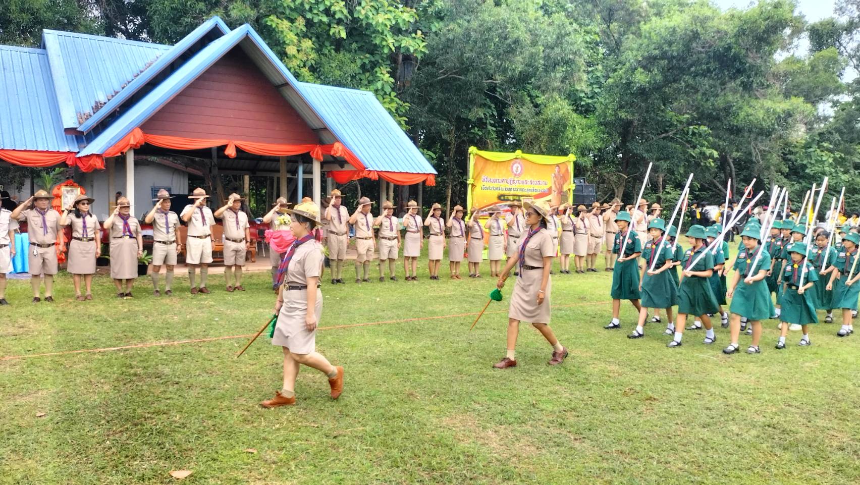 วันอังคารที่ 1 กรกฎาคม /2568 เวลา 09.00 น. ดร.วิโรจน์ ค้อไผ่ ผอ.สพป.ขอนแก่น เขต 4 เป็นประธานในพิธีทบทวนคำปฏิญาณและสวนสนามของลูกเสือ เนตรนารี เนื่องในวันคล้ายวันสถาปนาคณะลูกเสือแห่งชาติ กล่าวรายงานโดยนางกรรณิกา ซาหยอง รอง ผอ.สพป.ขอนแก่น เขต 4 พร้อมด้วยผู้บังคับบัญชาลูกเสือ เนตรนารี กลุ่มโรงเรียนในอำเภอน้ำพองทั้ง 6 กลุ่มโรงเรียน และโรงเรียนเปรมติณสูลานนท์ สังกัดองค์การบริหารส่วนจังหวัดขอนแก่น โดยมีลูกเสือสำรอง ลูกเสือสามัญ ลูกเสือสามัญรุ่นใหญ่ และผู้บังคับบัญชาลูกเสือ รวมจำนวน 1,212 คน เข้าร่วมในพิธี กิจกรรมประกอบด้วย การทบทวนคำปฏิญาณและสวนสนามของลูกเสือ เนตรนารี การส่งลูกเสือ เนตรนารีร่วมบำเพ็ญประโยชน์ กิจกรรมรณรงค์ต้านยาเสพติด กิจกรรมช่วยเหลือสังคม กิจกรรมการปลูกป่า และการเข้ารับการฝึกอบรมตามหลักสูตรผู้บังคับบัญชาลูกเสือ และหลักสูตรลูกเสือจิตอาสาพระราชทาน ณ สนามกีฬาโรงเรียนบ้านเพี้ยฟานโนนสวรรค์ ตำบลบัวเงิน อำเภอน้ำพอง จังหวัดขอนแก่น