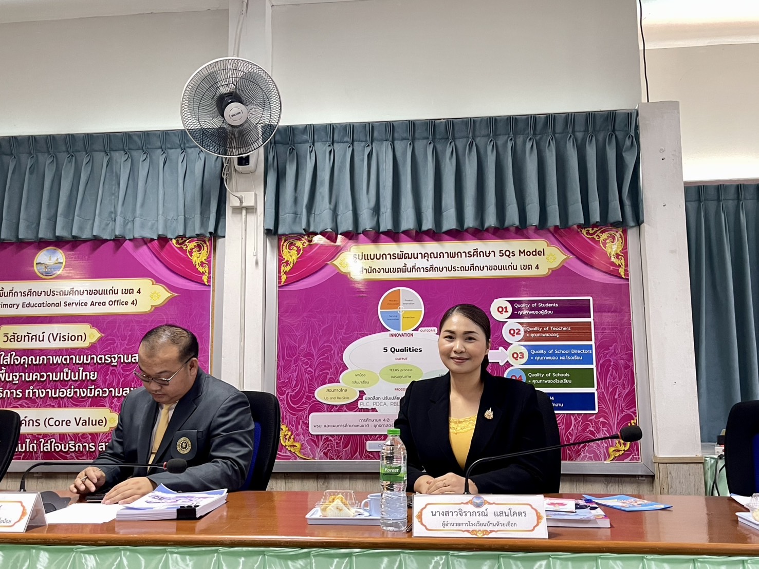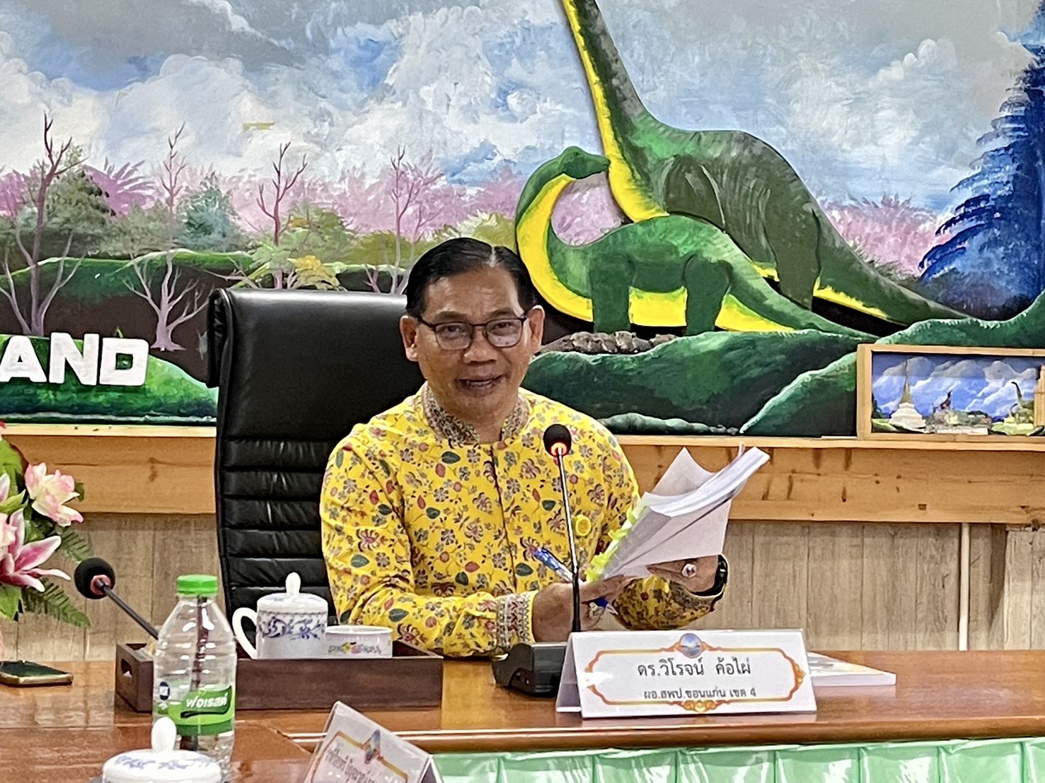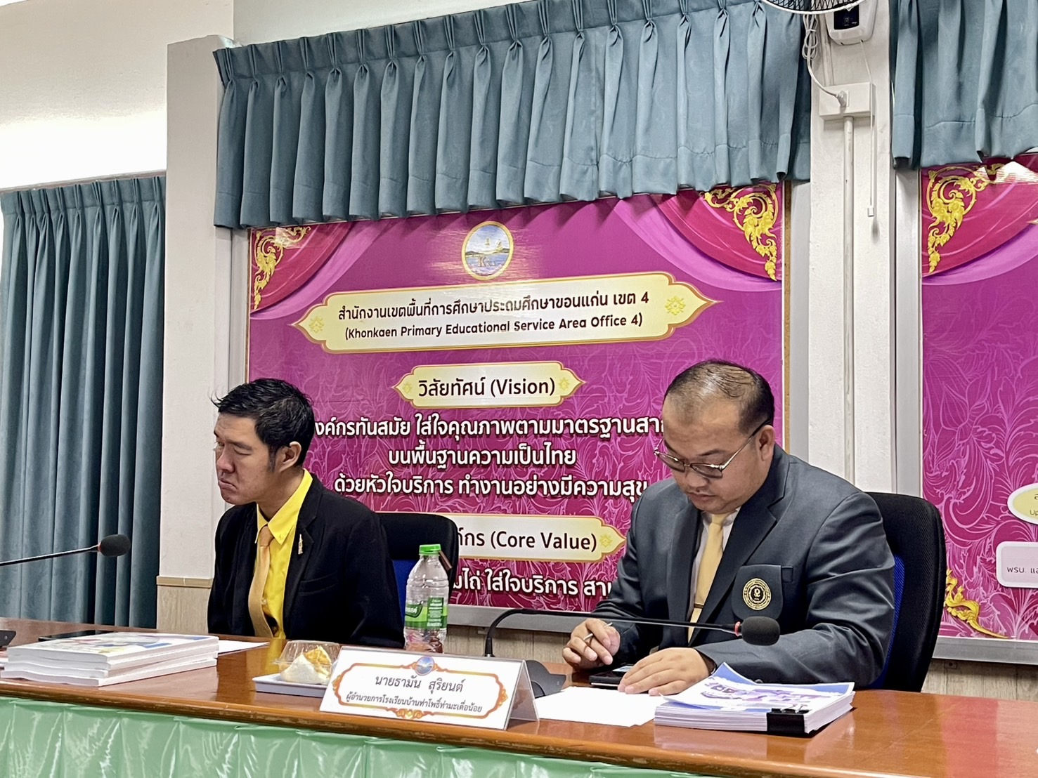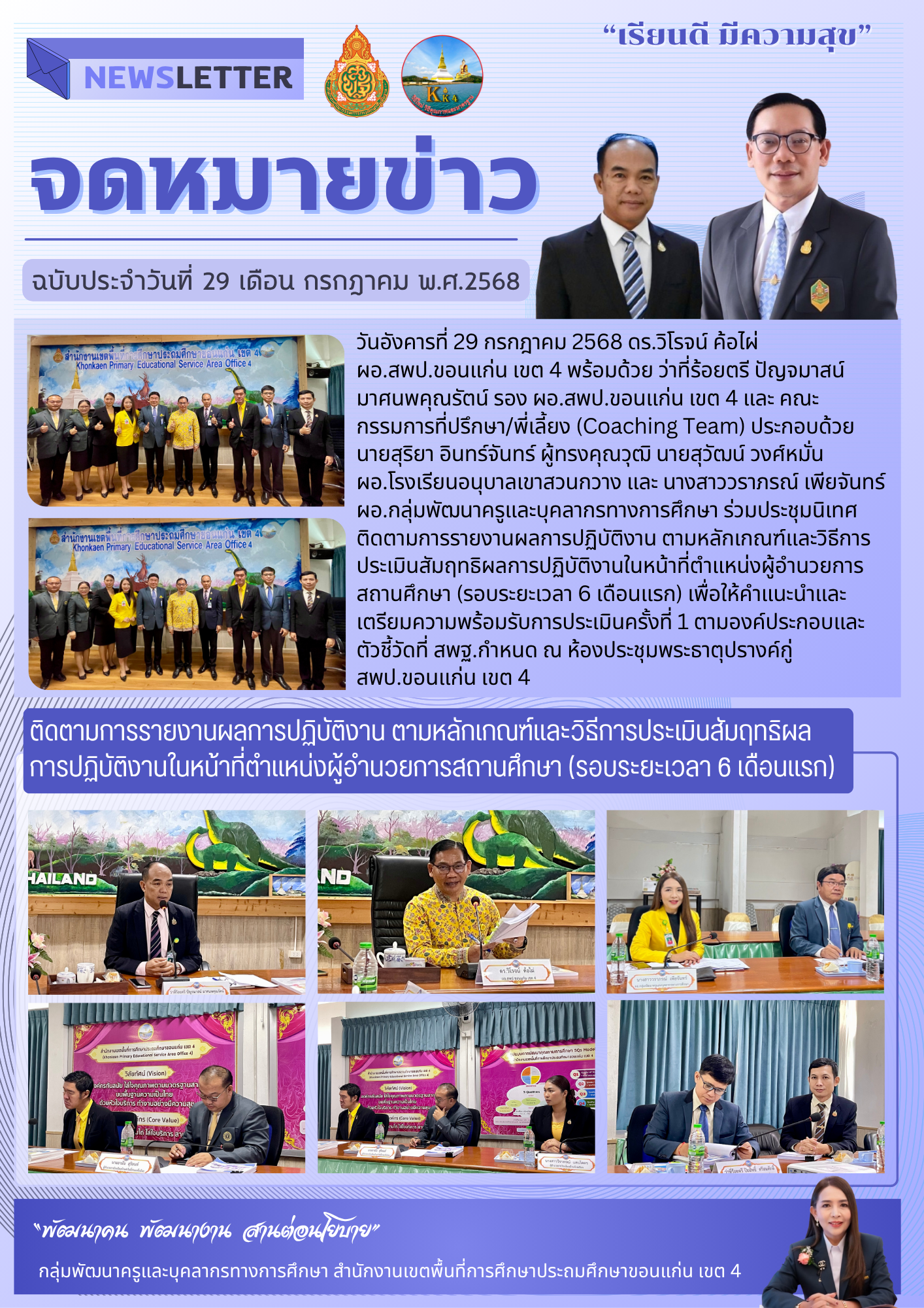 วันอังคารที่ 29 กรกฎาคม 2568 ดร.วิโรจน์ ค้อไผ่ ผอ.สพป.ขอนแก่น เขต 4 พร้อมด้วย ว่าที่ร้อยตรี ปัญจมาสน์ มาศนพคุณรัตน์ รอง ผอ.สพป.ขอนแก่น เขต 4 และ คณะกรรมการที่ปรึกษา/พี่เลี้ยง (Coaching Team) ประกอบด้วย นายสุริยา อินทร์จันทร์ ผู้ทรงคุณวุฒิ นายสุวัฒน์ วงศ์หมั่น ผอ.โรงเรียนอนุบาลเขาสวนกวาง และ นางสาววราภรณ์ เพียจันทร์ ผอ.กลุ่มพัฒนาครูและบุคลากรทางการศึกษา ร่วมประชุมนิเทศติดตามการรายงานผลการปฏิบัติงาน ตามหลักเกณฑ์และวิธีการประเมินสัมฤทธิผลการปฏิบัติงานในหน้าที่ตำแหน่งผู้อำนวยการสถานศึกษา (รอบระยะเวลา 6 เดือนแรก) เพื่อให้คำแนะนำและเตรียมความพร้อมรับการประเมินครั้งที่ 1 ตามองค์ประกอบและตัวชี้วัดที่ สพฐ.กำหนด ณ ห้องประชุมพระธาตุปรางค์กู่ สพป.ขอนแก่น เขต 4