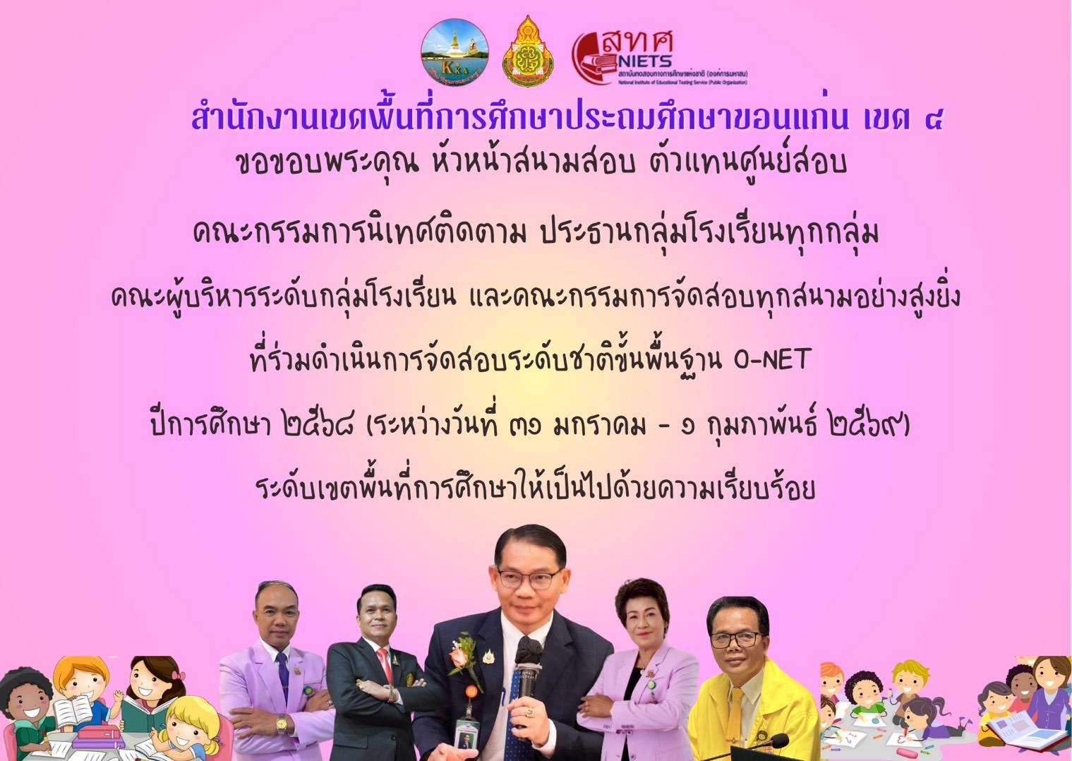 วันที่ 31 มกราคม -1 กุมภาพันธ์ 2569 ศูนย์สอบสพป.ขอนแก่น เขต 4 ได้ดำเนินการจัดสอบระดับชาติขั้นพื้นฐาน O-NET ประจำปีการศึกษา 2568 มีนักเรียนระดับชั้นมัธยมศึกษาปีที่ 3 เข้าสอบจำนวน 488 คน คิดเป็นร้อยละ 83.28 จากนักเรียนทั้งหมด 586 คน และนักเรียนระดับชั้นประถมศึกษาปีที่ 6 เข้าสอบจำนวน 2,233 คน คิดเป็นร้อยละ 96.58 จากนักเรียนทั้งหมด 2,312 คน