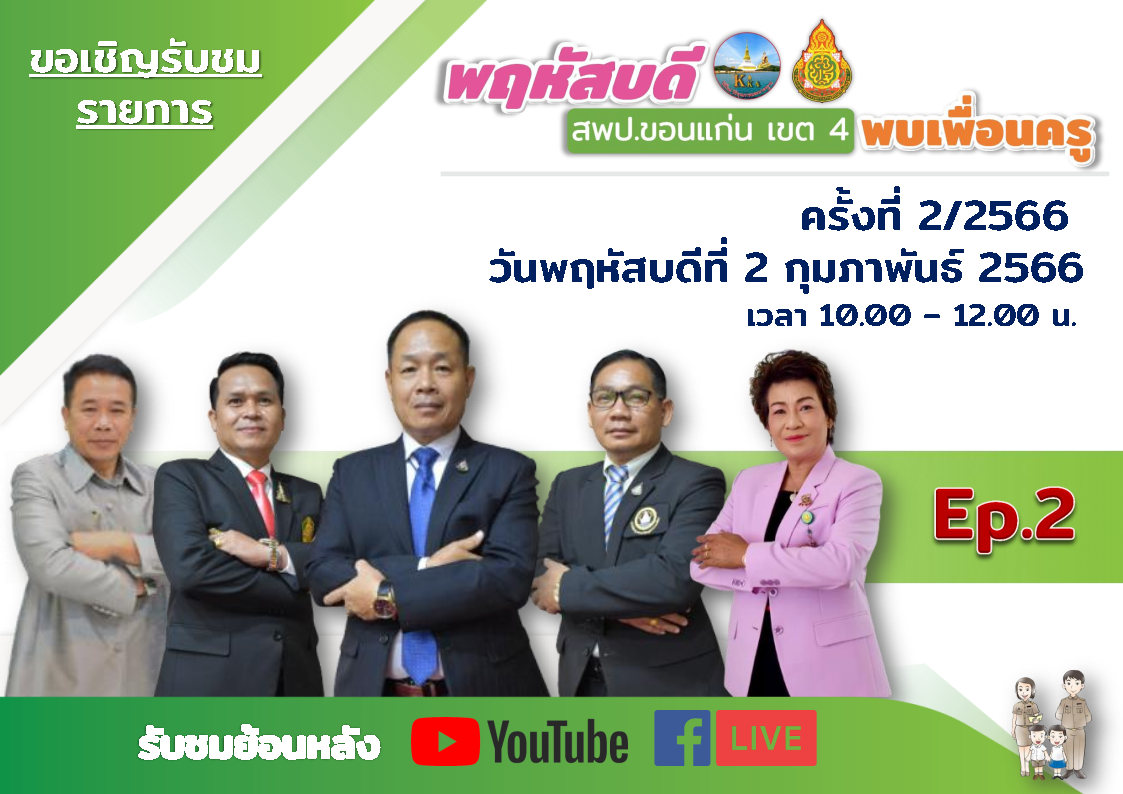 นายชาญกฤต น้ำใจดี ผอ.สพป.ขอนแก่น เขต 4 ร่วมรายการ พฤหัสบดี สพป. ขอนแก่น เขต 4 พบเพื่อนครู ครั้งที่ 2/25660 และรายการรอบรั้วโรงเรียน พร้อมด้วย รอง ผอ.สพป. ขอนแก่น เขต 4 นายวิโรจน์ ค้อไผ่ นายนิสิต สายโยค นางกรรณิกา ซาหยอง ณ ห้อง Live Stream DLICT อาคาร 1 ชั้น 2 สพป. ขอนแก่น เขต 4